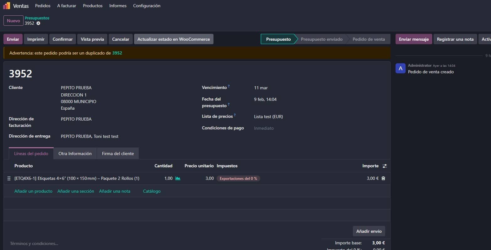 Cuando cambies el estado en Odoo, se actualiza en WooCommerce, con el botón [ Actualizar estado en WooCommerce ].